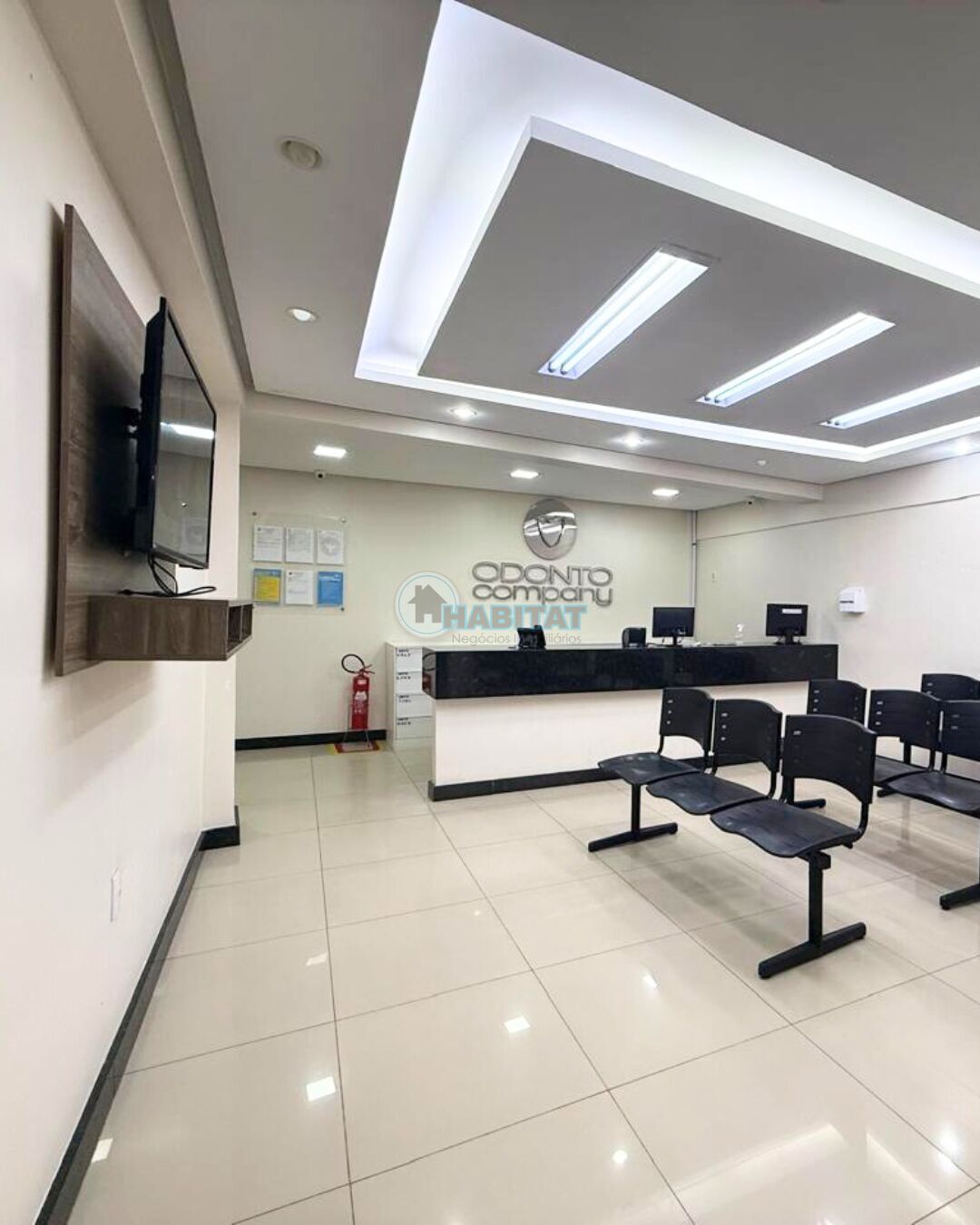 O prédio ainda conta com 2 recepções e 5 banheiros. Além de copa para funcionários, 2 escritórios, sala de raio X , já com paredes apropriadas.